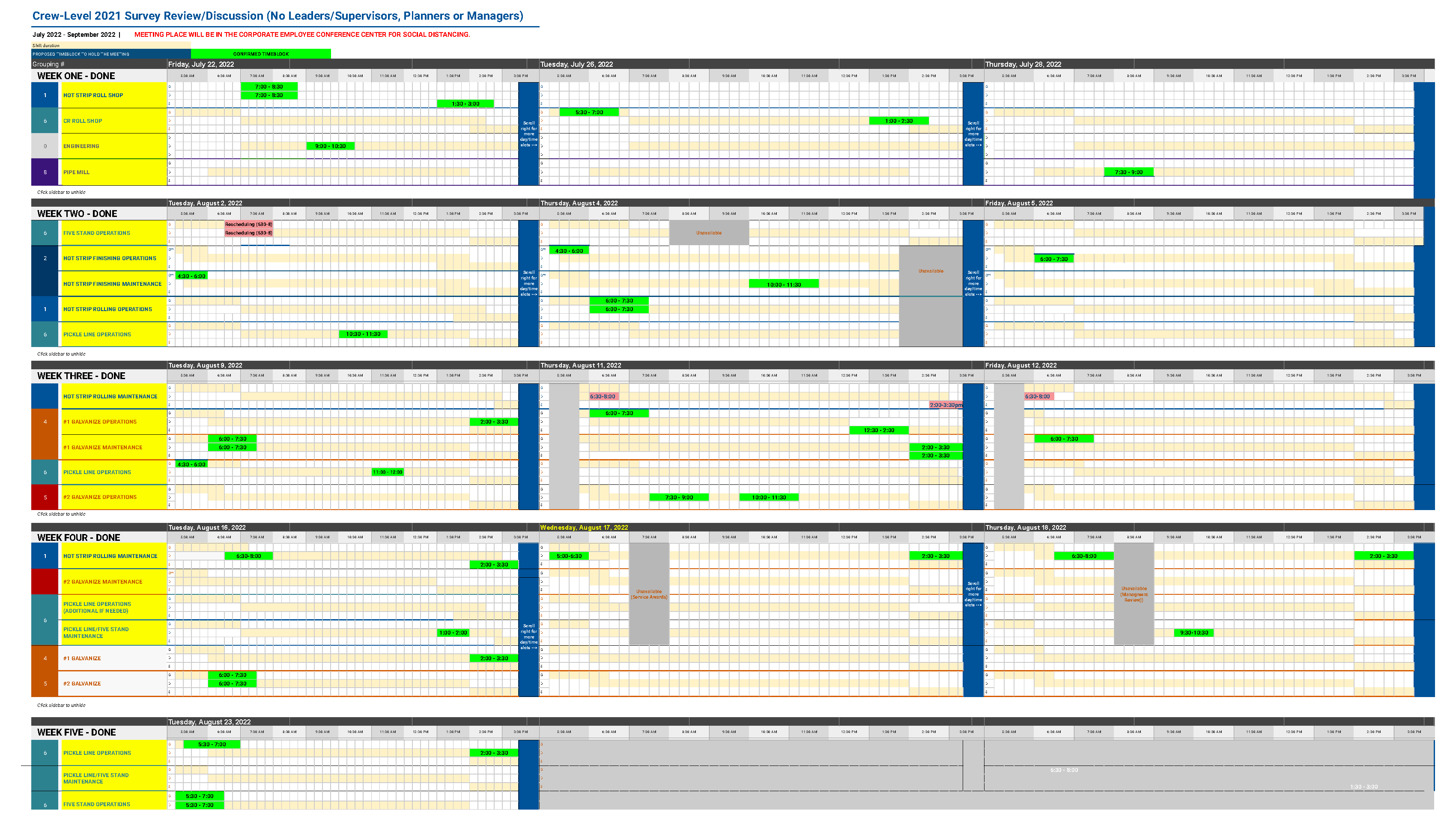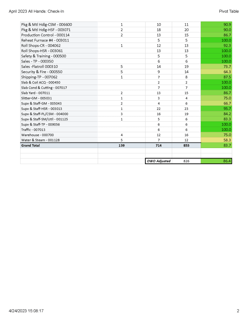 I was the administration manager of the company-wide, 100+-question online employee survey, and also served as the data analyst cleaning and compiling raw survey data reviewing 30 departments into Excel spreadsheets to later share as visual feedback reports. To simplify the administration process for monitoring online survey takers and hard copy survey takers, I established an online survey administration schedule between the Communications and HR team to ensure full coverage, while respecting equal time distribution amongst the team. Following the completion of data cleaning and analysis of the surveys, I developed an Executive Summary report and comprehensive feedback spreadsheet of the findings, scores and improvement recommendations by area. Once the initial executive review meeting concluded, I constructed a schedule to meet with three- and four-shift crews from each mill equal to 600 employees in total over three-months to share the simplified survey results using PowerPoint data visualization for further elaboration and HR note taking.